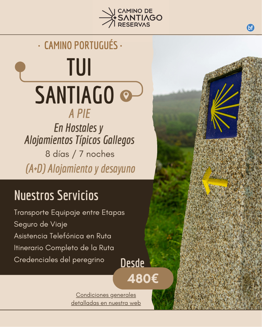 Tui - Santiago de Compostela a Pie. Camino Portugués. 7 Noches/8 Días. Hostales y Alojamientos Gallegos. 480€