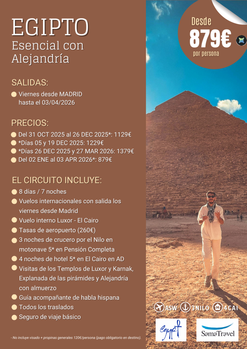 "EGIPTO Esencial + Alejandría" 8 días circuito [Desde Madrid] (01Nov25-03Abr26) **Desde 879€**
